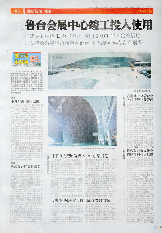 《魯臺會展中心竣工投入使用》——濰坊晚報2012年8月2日A6版
