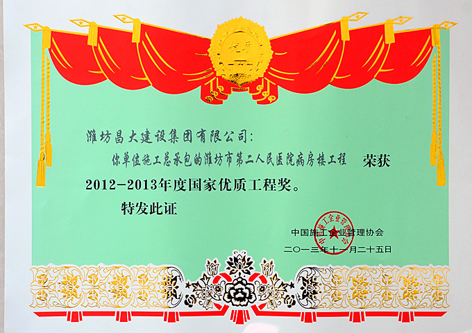 2013年12月27日,中國施工企業管理協會在北京召開“2012-2013年度國家優質工程獎”表彰大會,為獲獎者頒獎。由集團第一分公司施工的濰坊市第二人民醫院病房樓工程獲此殊榮。 國家優質工程獎是我國工程建設質量方面跨行業、跨專業的國家級榮譽獎勵,已經成為政府提倡、社會知名、企業向往、專家認可、實踐過硬的著名品牌,以其權威性、規范性、指導性、示范性在工程建設領域享有崇高的聲譽。