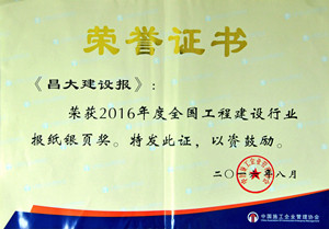 2016年8月5日,中國施工企業管理協會召開年度通聯工作會議,通報表彰有關獎項。集團《昌大建設報》等63家行業內報紙獲得“銀頁獎”。這也是集團連續多年獲此殊榮。