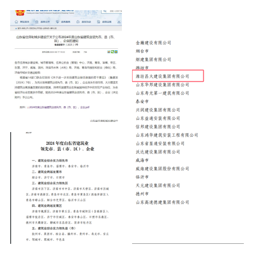 近日,山東省住房和城鄉建設廳發布了《關于公布2024年度山東省建筑業領先市、縣(市區)、企業的通知》(魯建建管字[2025]5號)。集團公司被評為2024年度山東省建筑業領先企業。