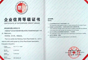 &On June 24, 2016, China real estate credit enterprise award ceremony was held in Changzhou. 40 real estate enterprises including Changda real estate Weifang Taihe Real Estate Co., Ltd. were awarded the title of "national real estate AAA credit enterprise". &The national real estate industry credit evaluation is organized by China Real Estate Association and China Real Estate Research Association. It is the only authoritative enterprise credit rating certification in the national real estate industry. It is reported that the real estate industry credit rating adopts the automatic declaration of real estate enterprises, the field evaluation of the third-party evaluation agency, and the expert group makes a comprehensive evaluation on the objective credit ability of the enterprise, the operation credit status of the enterprise, the performance of social responsibility credit of the enterprise and the future social credit ability through data review, on-site questions and real estate investigation. After the strict credit assessment, only those units that are recognized as A-level or above by the real estate industry association of the region where they are located are qualified to apply for the national credit rating. &Taihe company will continue to adhere to the enterprise tenet of "reputation, quality, service and efficiency", further establish a good social image of honesty and trustworthiness, and make positive contributions to the re development of Changda real estate.