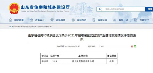近日,山東省住建廳發(fā)布了《山東省住房和城鄉(xiāng)建設(shè)廳關(guān)于2021年省級裝配式建筑產(chǎn)業(yè)基地實施情況評估的通報》。山東省共有121家產(chǎn)業(yè)基地通過評估,其中,省級現(xiàn)場評估的44家產(chǎn)業(yè)基地中,昌大建筑科技有限公司等12家產(chǎn)業(yè)基地評估結(jié)果為“優(yōu)秀”。