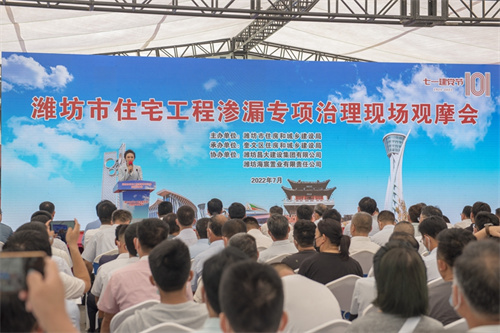 2022年7月1日上午,由濰坊市住建局組織的“濰坊市住宅工程滲漏專項治理”觀摩會在集團二建公司總承包施工的海通恒信·鳶都名筑項目現場舉行。