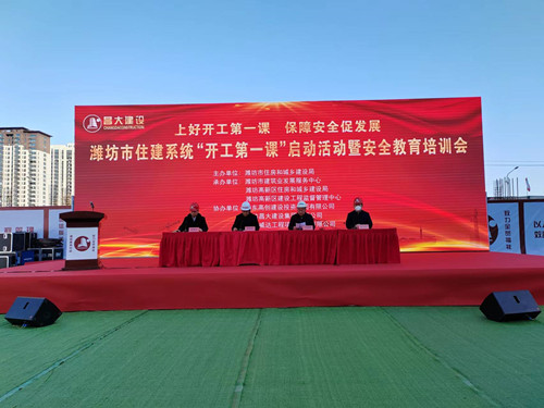 2023年2月15日上午,濰坊市住建系統“開工第一課”啟動活動暨安全教育培訓會議在集團八建公司高創·水緣灣項目現場舉行。濰坊市住建局黨組書記、局長鐘光文,濰坊市建筑業發展服務中心主任許增賢,高新區住建局局長牟軍生等出席活動。集團公司總裁朱九洲,副總裁楊成國出席并全程參與活動。各縣市區住建局主要負責人、分管負責人,相關業務科室負責人;房地產開發企業、建筑施工企業、 監理企業分管安全負責人,集團安全生產部、各基層公司安全總監、安全生產部全體人員共約200余人參會。