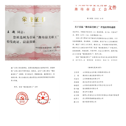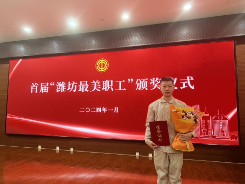 2024年1月19日上午,由市總工會舉辦的首屆“濰坊最美職工”頒獎儀式在濰坊市工人文化宮一樓西區104會議室隆重舉行。集團公司工會主席穆乃出席頒獎儀式。在首屆10名最美職工中,集團機施公司維修電工王超獲此殊榮。